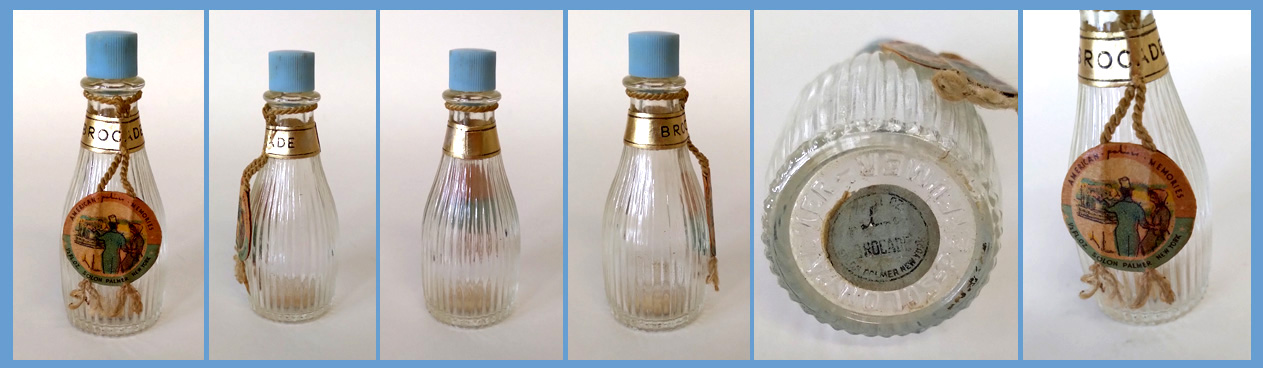 This vintage 1/2 ounce bottle by Salon Palmer, New York, once held Brocade perfume. The bottle is clear ribbed glass. The plastic cap is pale blue. There is a foil label around the neck with the fragrance name, Brocade, and hang tag with interesting graphics also attached to the neck with a silk cord. The hang tag reads," American palmer Memories, Solon Palmer New York. On the reverse side is the date 1847, the date Solon Palmer was established. Label on the bottom.