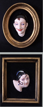 From Pauline's collection. Pre-1939. Exceptional pair of framed, German, flat head or bas relief porcelains. Pierrot is mounted on black velvet in a gilded oval frame. His companion, Pierrette, is also mounted on black velvet in a square gilded frame. What an exceptionally rare and unique opportunity to own this distinctive pair of half doll-related items! I found them at a conventional doll show that was taking place in downtown Austin, Texas in February 1996, thirty years ago. The porcelains were made by Hertwig. Both figures are 3 inches tall. Pierrot's oval frame measures 4 1/4 inches across by 5 1/2 inches long, and Pierrette's square frame measures 4 3/4 inches across by 5 1/2 inches long. I knew I had the perfect place where I wanted to hang them, just above the TV set in my bedroom. Sold as a pair. (Click on the gallery picture to see my special collectibles/home decor couple.)