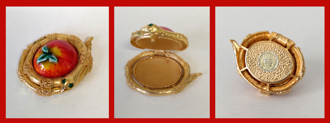 RARE, SCHIAPARELLI, "S", JEWELRY PIN, SOLID PERFUME COMPACT, c.1961