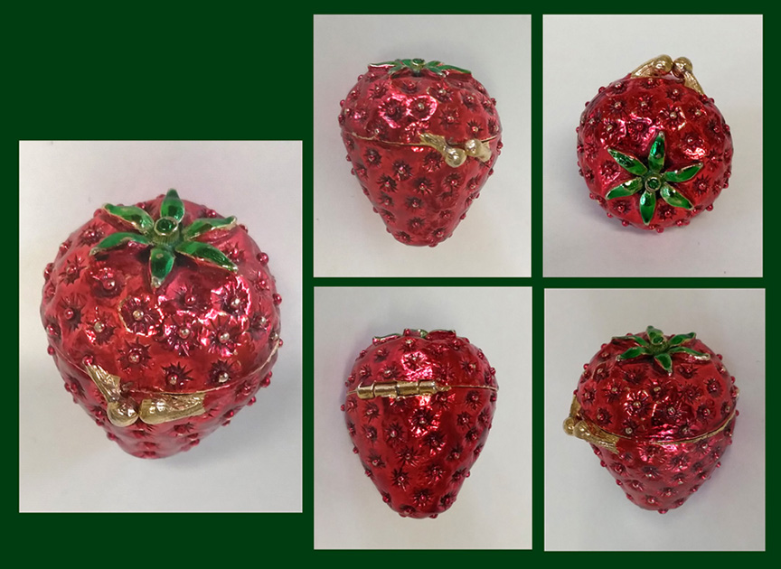 Very collectible, very desirable, this bright red, luscious delight was created by Florenza for an unknown solid perfume fragrance. Gold-tone metal, figural, solid perfume compact is in the shape of a fresh, ripe strawberry with an enameled bright green stem on the top. The interior of the compact is embossed, "Phalen Dallas" and "Florenza." Condition of the enamel on the compact is in excellent condition.