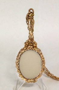 Sitting pretty atop a golden ornate base is a graceful, faux-ivory, reclining horse. This very large compact from Corday has a hint of the Orient about it. The compact still has most of its original Toujours Moi fragrance. The base is beautifully detailed. The "ivory" horse is made of resin and is strong and solid. Inside of the lid is stamped “CORDAY.†This is probably not a solid you would have carried in your purse...it's heavy! It would have been better placed on a lady's vanity table for decoration and to be close at hand to use when prettying-up for the day.