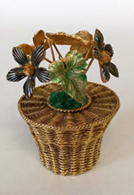 This is Max Factor's version of a woven basket filled with flowers and leaves suspended above the compact on "wire stems". Now that's very creative! This container once held Factor's popular fragrance, Hypnotique. The golden pot has a woven design, and the basket lid has a cluster of flowers attached at the center in a circle of green crystal-like chips. This is a special vintage perfume solid compact that will make your collection bloom!