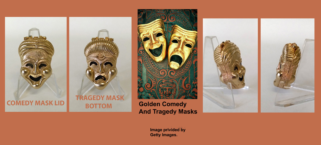 RARE, COMEDY/TRAGEDY THEATER MASKS, SOLID PERFUME COMPACT, c.1969