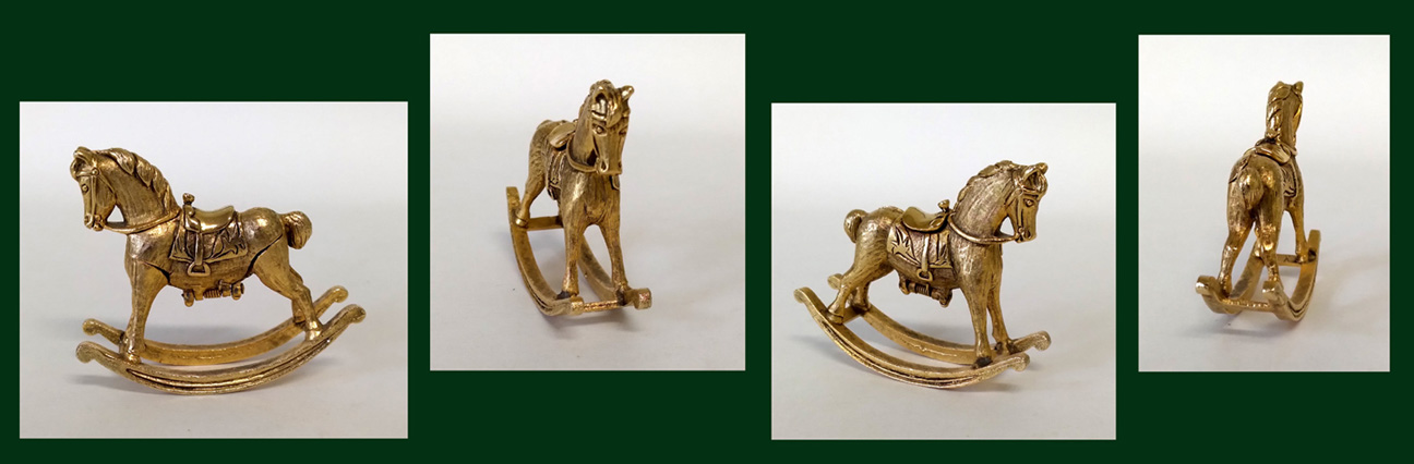 This is another of the creative 1970s perfume solid compacts from Max Factor. This charming child's rocking horse is filled with Factor's popular Hypnotique solid perfume. Lots of detail. The pommel on the saddle provides access to the hidden spring loaded perfume compartment in the horse's body.