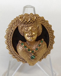 Interesting and hard-to-find Florenza solid perfume compact known to solid collectors as "The Queen of Hearts. The lid is adorned with the beautifully designed bust of the Queen of Hearts shaped into a tapered heart that spills over the edge of the lid. She wears a necklace with a large single emerald pendant and smaller emerald colored glass stones. A queenly crown is on her head and she is happily smiling. Behing the bust and contrasting with the bright gold metal of the container is a tortoise insert. So unique, striking and definitely desirable.