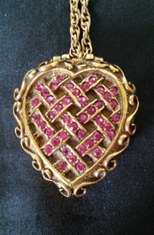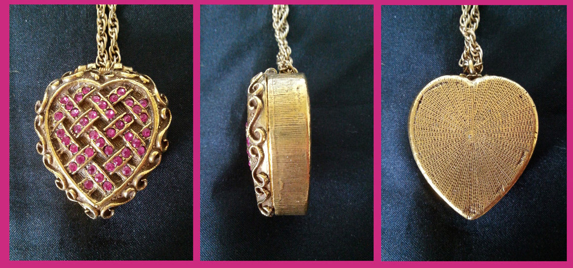Rare Schiaparelli heart-shaped, solid perfume compact pendant. The antiqued gold-tone case with lattice design on the lid is set with "Shocking" pink, (fucshia), rhinestones. It is nearly full with Elsa Schiaparelli's famous, "Shocking" perfume-scented, solid perfume. The jewelry heart pendant comes on a chain. This is a rare perfume item, not often offered for sale, a real find for the serious perfume collector. A lovely piece of perfume jewelry to wear and to display in your collection. See P961, Schiaparelli jewelry pin perfume solid, with pink stones and P1915, Schiaparelli purse solid compact, with white stones also for sale.