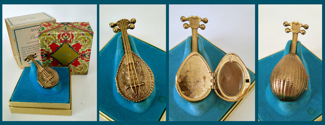 Avon gold mandolin solid compact designed to hold Avon's Perfume Glace, assorted fragrances. The charming little mandolin was introduced in 1971...50 years ago this year! Presentation has outer sleeve and inner box. The box has blue flocking on the inside box bottom with a molded platform that holds the mandolin. Perfume remains in container.