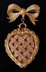 Rare Schiaparelli heart-shaped, solid perfume jewelry compact for her fragrance, "S", c. 1961. It is now 64 years old!! The antiqued gold-tone case with lattice design on the lid is set with pink rhinestones. It is nearly full with Elsa Schiaparelli's famous, "S" perfume-scented, solid perfume. The solid is suspended from a pretty gold bow brooch, with an "O" ring, and can be detached if desired. Perfect gold foil label on bottom, "Parfums Schiaparelli Inc., "S" Creme Parfum, .12 oz., Net Wt." This is a rare perfume item, not often offered for sale, a real find for the serious perfume collector. See P1915, Schiaparelli purse solid compact, with white rhinestones and P2133, Schiaparelli jewelry pendant on a chain solid compact, with fucshia rhinestones for sale.
