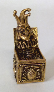Very collectible and vintage, gold-tone metal, figural compact by Faberge for their, "Hypnotique." solid perfume. The highly-detailed design of a Jack-in-the-Box with a moveable head on a spring has been a much sought-after and hard-to-find collectible perfume solid from the 1960s. Gold foil bottom label. Full perfume.