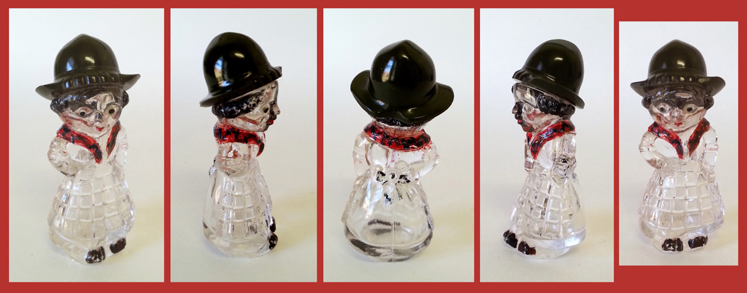 Novelty perfume bottles were often modeled after cartoon characters. This little guy is similar to characters seen in 1930s-1940s newspaper cartoon strips. The molded glass frosted bottle has him dressed in a plaid suit with a stove top hat that serves as the bottle cap. He has enamel-painted googly eyes and black tie and shoes. Possibly a Lioret novelty character perfume bottle.