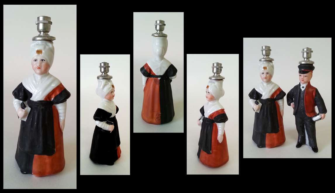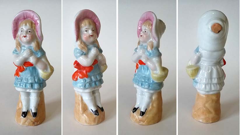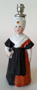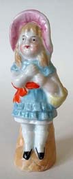 From Pauline's collection. German porcelain crown top perfume bottle of a Dutch girl in Delft-style blue and white glaze. This is one of a pair. Her mate is a Dutch boy also finished in the Delft style glaze. The Dutch child is holding a potted tulip and her white apron is wind-blown. May have held Boldoot cologne. Shown on page 133 of The Crown Top Book by Pauline Turco.