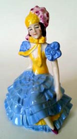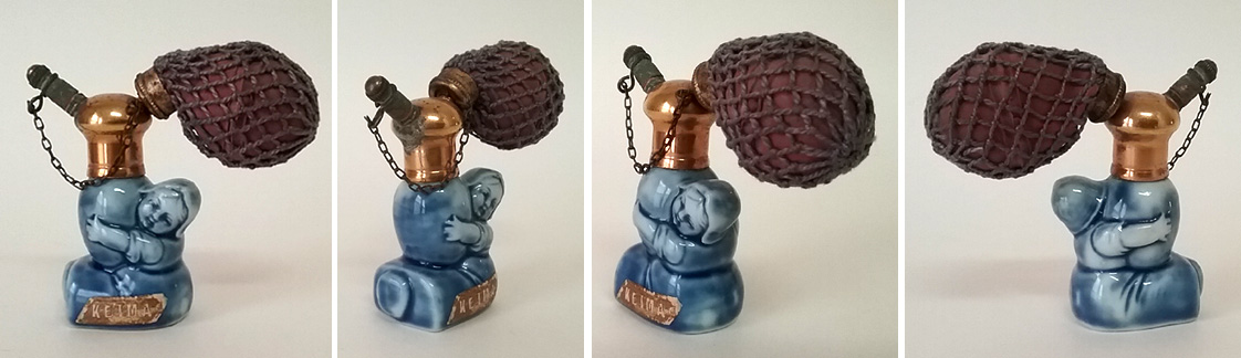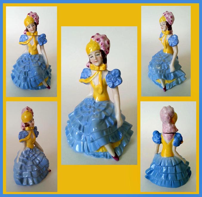 From Pauline's collection. This porcelain perfume bottle is modeled as a happy little Dutch man with tan luster pants, orange suspenders, and blue tie. His black hat forms the stopper. The front label has the perfumer's name, De Linet, and fragrance, Jasmin. The bottom of the bottle is stamped with a red, unidentified maker or importer's mark, a chrysanthemum in a circle, that reads, "Hand Painted. Made in Japan." Shown on page 201 of The Crown Top Book by Pauline Turco.
