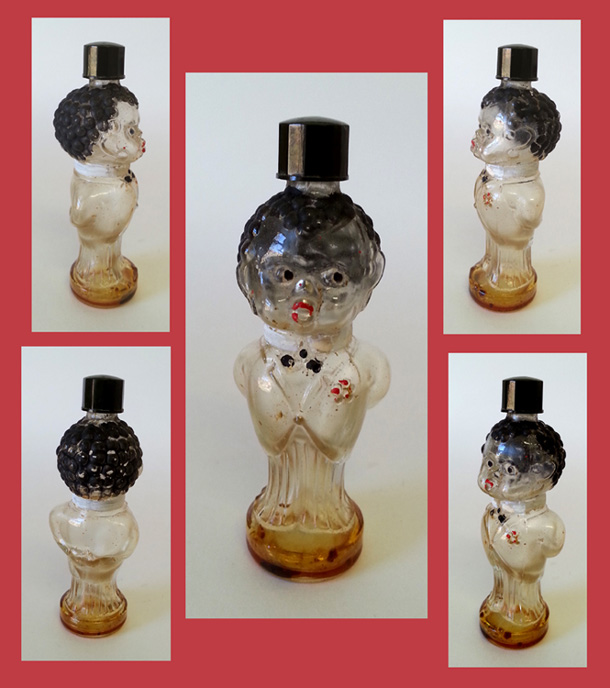 Black people as novelty perfume bottles are the hardest to find. This novelty black man is a particularly appealing bottle because it is not a caricature depiction of a black person. He stands with his hands clasped behind his back, and is dressed in a white dress shirt and black tie, formal evening jacket, and striped pants. A red boutonniere is painted on his lapel. His black curly hair is well painted. In profile, he has chubby cheeks, and distinctive African-American features. This is a great novelty black man for your collection.