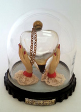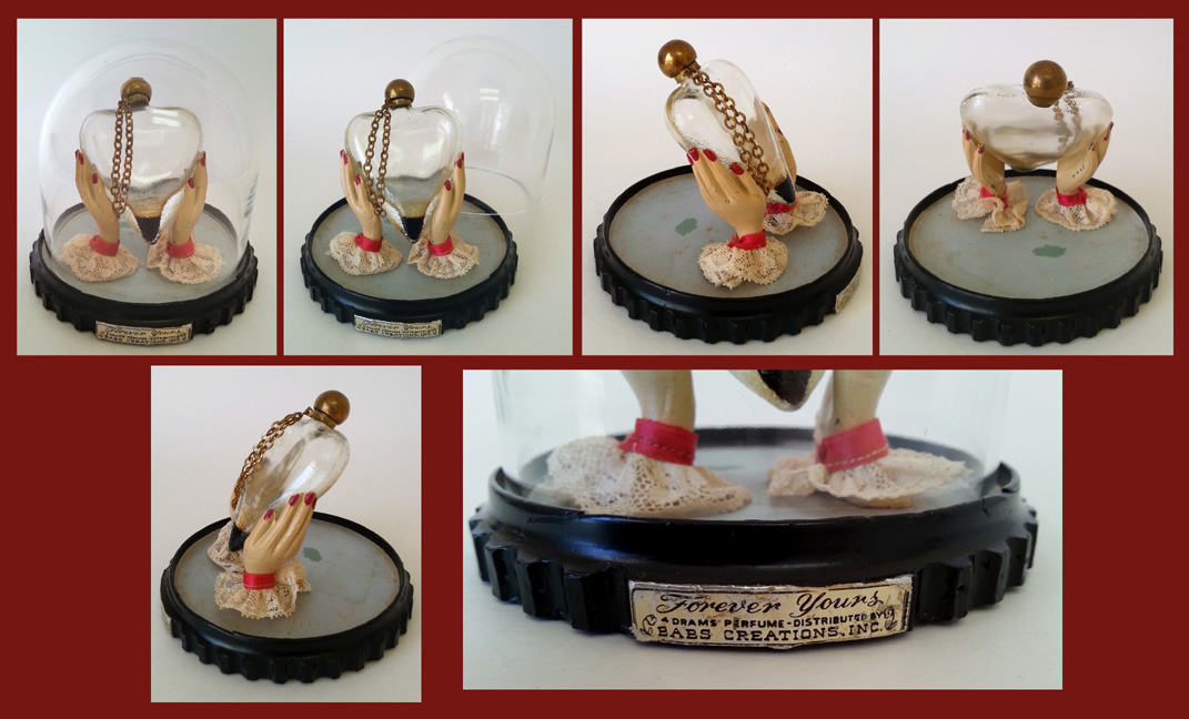 This clever novelty is another wonderful domed presentation found at Five and Dime stores in the 1930s and 40s. A clear glass, heart-shaped perfume bottle rests between two metal hands. Fingers have red-polished finger nails. A bit of lace and bright pink ribbon are fastened around each wrist. The gold metal cap is attached to the bottle with a gold-tone chain. The interior of the presentation is lined with light blue satin, and the base has a silver foil label with the fragrance name, "Forever Yours Babs Creations, Inc." It is rare to find this desirable novelty presentation in as good a condition as this one.
