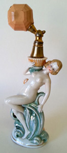 From Pauline's collection. This bottle is in the form of a kneeling Siamese lady holding a fan. Unusual gray monochrome glaze typical of the Schafer & Vater Company. Model number 1710. Shown on page 231 of The Crown Top Book by Pauline Turco.