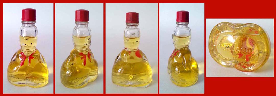 Cute little Dutch boy dime store novelty perfume. He wears fat pants and a red necktie. Red Bakelite cap. Bottle has "Holland" molded in the glass on the bottom, an indication the bottle was made by the Dutch company, Kleinkramer. This company provided molded glass figural bottles decorated with unfired enamel to novelty perfumers in the 1940s. Still has all of its original perfume.