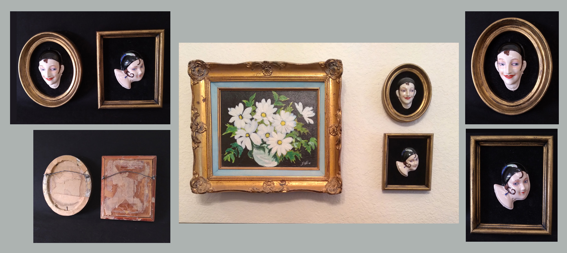 From Pauline's collection. Pre-1939. Exceptional pair of framed, genuine antique, German, flat head or bas relief porcelains. Pierrot is mounted on black velvet in a gilded oval frame. His companion, Pierrette, is also mounted on black velvet in a square gilded frame. What an exceptionally rare and unique opportunity to own this distinctive pair of half doll-related items! I found them at a conventional doll show that was taking place in downtown Austin, Texas in February 1996, thirty years ago. The porcelains were made by Hertwig. Both figures are 3 inches tall. Pierrot's oval frame measures 4 1/4 inches across by 5 1/2 inches long, and Pierrette's square frame measures 4 3/4 inches across by 5 1/2 inches long. I knew I had the perfect place where I wanted to hang them, just above the TV set in my bedroom. Sold as a pair. (Click on the gallery picture to see my special collectibles/home decor couple.)