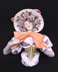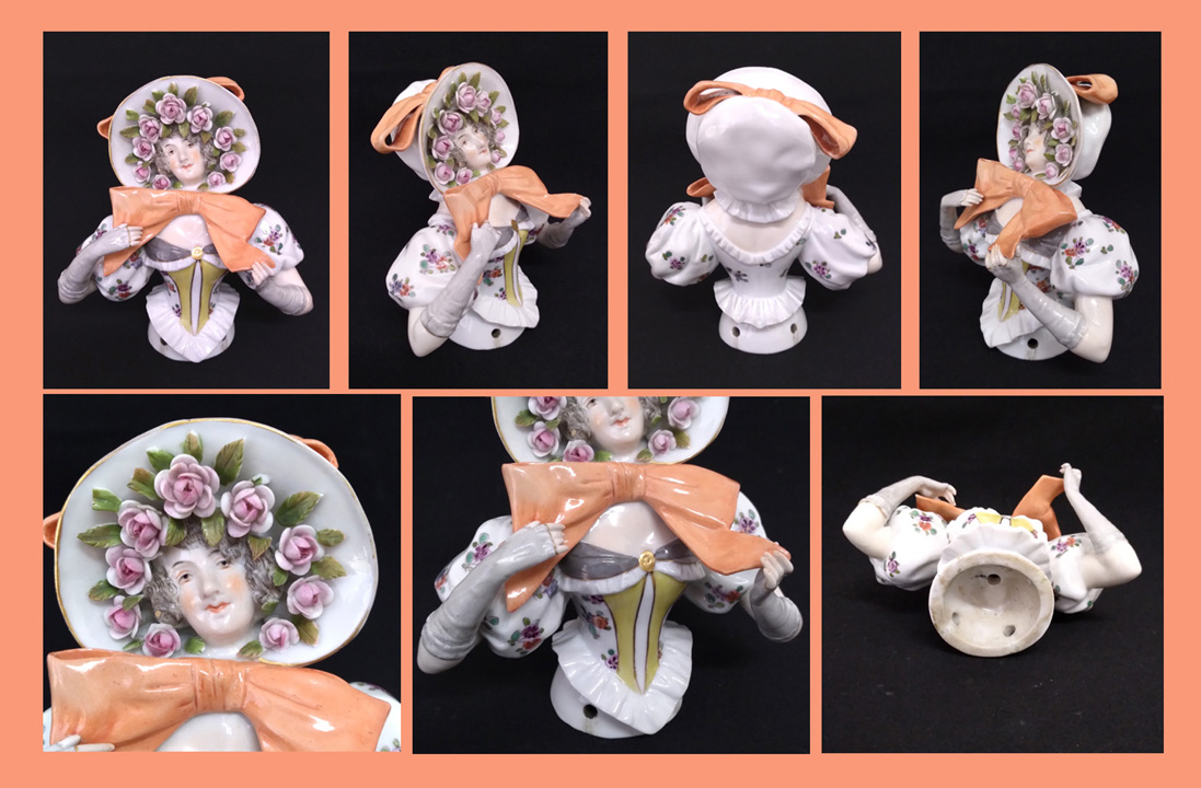 From Pauline's collection. Pre-1939. Lady half doll. This intricate half doll is holding a porcelain box with the silhouette of a loved one on it in the palm of her hand. Her early Victorian hairdo has a love knot in the back decorated with a blue ribbon and clusters of dark blond ringlets on either side of her face. The bodice of her dress has covered with hand-painted flowers and a scarf is loosely draped over one shoulder and across her arm with the ends hanging down. All of these lovely details on the front and back of this half doll required skilled undercutting, a sculpting technique that created the interesting spaces and protrusions. It also required the use of multi-piece molds to successfully cast it and reassembly of the pieces before firing it, all of which was complex, time-consuming, more costly, and required skilled craftsmanship to successfully complete. However, the result was a beautiful, elaborate, and intricate half doll that is highly prized and sought-after by collectors.