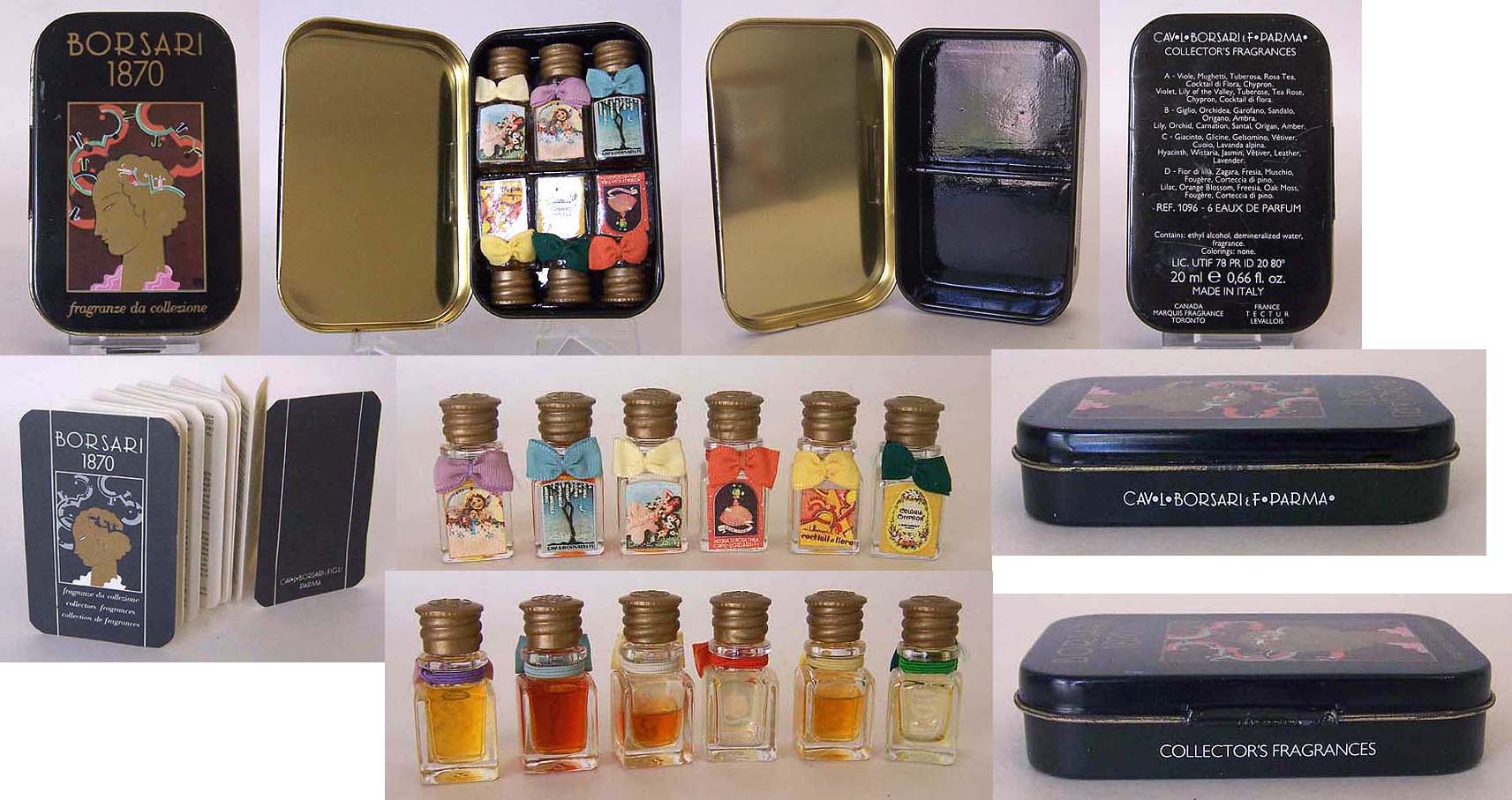 Six mini glass bottles with gold-colored, plastic, threaded caps. All have labels and ribbons around their necks. The metal box has the profile of a deco lady and is marked "BORSARI 1870 / fragranze da collezione." There is no bar code on the box which, probably, dates the presentation to the early 1970s. Included with this set is a, folded, 31-page brochure (2 1/8" x 3 1/4" approx.) describing 27 Borsari fragrances in Italian, English and French. The fragrances in this box are marked on the bottom of the box in Italian and English for the first group (A).