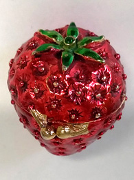 Very collectible, very desirable, this bright red, luscious delight was created by Florenza for an unknown solid perfume fragrance. Gold-tone metal, figural, solid perfume compact is in the shape of a fresh, ripe strawberry with an enameled bright green stem on the top. The interior of the compact is embossed, "Phalen Dallas" and "Florenza." Condition of the enamel on the compact is in excellent condition.