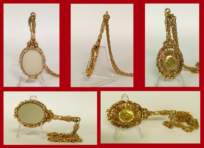 Great solid perfume jewelry necklace from Max Factor. This is a fancy, golden, hand-mirror pendant filled with Hypnotique fragrance. It is attached to a 12-inch gold link chain. The mirror on the lid is in excellent condition, the compact is chock full of original fragrancy and there is a gold foil label on the bottom. Doesn't get any better than that! This charming perfume jewelry would look stunning with your little black dress...or in your collection.