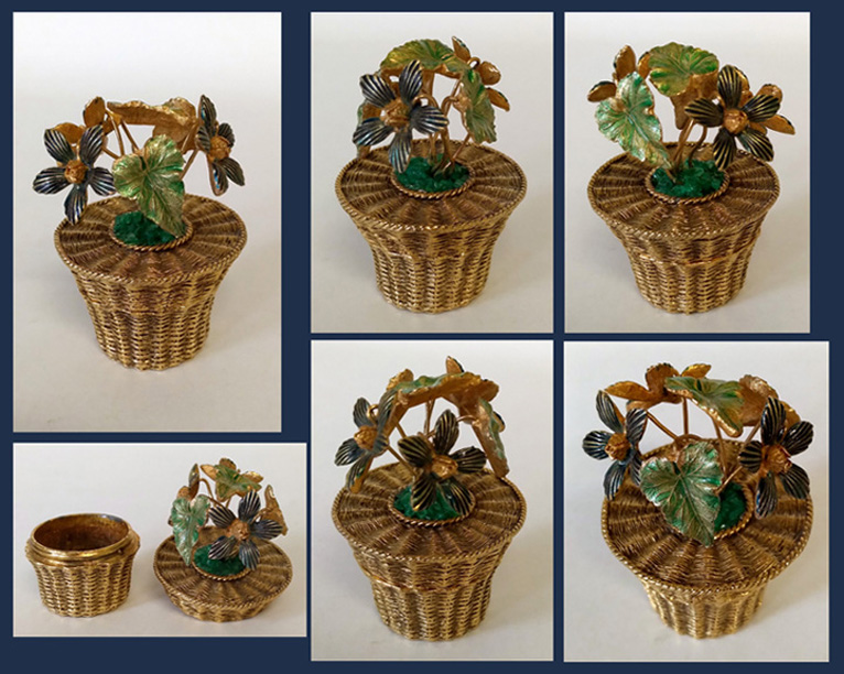 This is Max Factor's version of a woven basket filled with flowers and leaves suspended above the compact on "wire stems". Now that's very creative! This container once held Factor's popular fragrance, Hypnotique. The golden pot has a woven design, and the basket lid has a cluster of flowers attached at the center in a circle of green crystal-like chips. This is a special vintage perfume solid compact that will make your collection bloom!