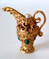 Beautiful perfume pomander in the shape of a pitcher. Stamped on the bottom of the piece is the maker's name, Florenza. This company, best known for its intricate and unique costume jewelry, was established in 1945 by Daniel Kasoff, Inc. in New York City. The brand "Florenza," named after his wife, Florence, was first used in 1949 or 1950. Pomanders were first recorded in Europe in the Middle Ages and were used as herbal amulets that were worn around the neck or placed in the home, with the intention of protecting the wearer from negative spirits, illnesses, or harmful energies like jealousy and envy. It was also used to mask unpleasant odors, personal or environmental. This pitcher is adorned with 3 oval cabochon turquoise stones on the lower part and 4 amethyst rhinestones on the hinged lid. Pomanders held neither liquid perfume nor waxy solid perfume. Instead, a piece of material or cotton ball was saturated with a fragrance and placed inside the pomander. The pierced lid allowed the fragrance inside to be dispersed. A synthetic pearl completes the jewels on this charming piece. The pendent is made of heavy cast metal covered in rich gold plating.
