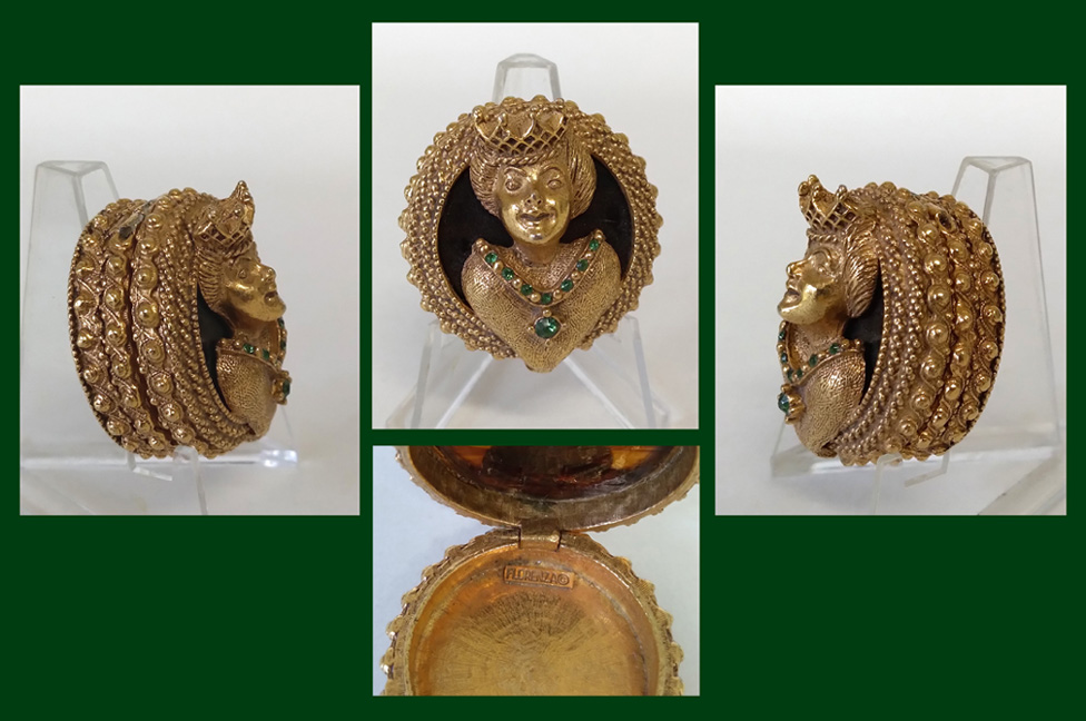 Interesting and hard-to-find Florenza solid perfume compact known to solid collectors as "The Queen of Hearts. The lid is adorned with the beautifully designed bust of the Queen of Hearts shaped into a tapered heart that spills over the edge of the lid. She wears a necklace with a large single emerald pendant and smaller emerald colored glass stones. A queenly crown is on her head and she is happily smiling. Behing the bust and contrasting with the bright gold metal of the container is a tortoise insert. So unique, striking and definitely desirable.