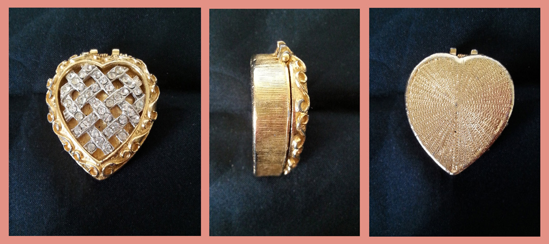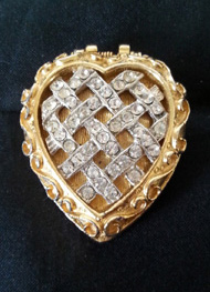Rare Schiaparelli heart-shaped, solid perfume compact. The antiqued gold-tone case with lattice design on the lid is set with clear white rhinestones. It is empty now, but once held one of Elsa Schiaparelli's famous perfume-scented solid perfumes. This famous designer's solid perfume compact for the purse is not often offered for sale, a real find for the serious perfume collector. See, also, P961, Schiaparelli perfume jewelry pin perfume solid, with pink stones and P2133, Schiaparelli jewelry pendant on a chain, solid compact, with fucshia rhinestones for sale. Lovely piece of perfume jewelry to wear and to display in your collection.