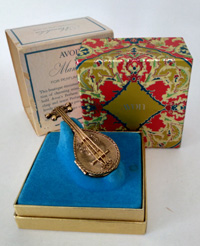 Avon gold mandolin solid compact designed to hold Avon's Perfume Glace, assorted fragrances. The charming little mandolin was introduced in 1971...50 years ago this year! Presentation has outer sleeve and inner box. The box has blue flocking on the inside box bottom with a molded platform that holds the mandolin. Perfume remains in container.