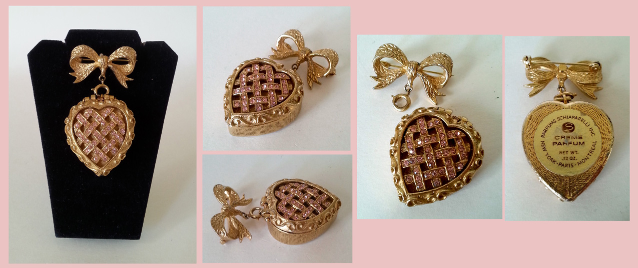Rare Schiaparelli heart-shaped, solid perfume jewelry compact for her fragrance, "S", c. 1961. It is now 64 years old!! The antiqued gold-tone case with lattice design on the lid is set with pink rhinestones. It is nearly full with Elsa Schiaparelli's famous, "S" perfume-scented, solid perfume. The solid is suspended from a pretty gold bow brooch, with an "O" ring, and can be detached if desired. Perfect gold foil label on bottom, "Parfums Schiaparelli Inc., "S" Creme Parfum, .12 oz., Net Wt." This is a rare perfume item, not often offered for sale, a real find for the serious perfume collector. See P1915, Schiaparelli purse solid compact, with white rhinestones and P2133, Schiaparelli jewelry pendant on a chain solid compact, with fucshia rhinestones for sale.