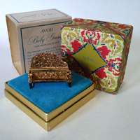 Avon gold piano, the "Baby Grand" solid compact designed to hold Avon's Perfume Glace in assorted fragrances. The charming little baby grand piano was introduced in 1971...50 years ago this year! Presentation has outer sleeve and inner box. The box has blue flocking on the inside box bottom with a molded platform that holds the piano. Under the lid of the piano is a full container of glace solid perfume.