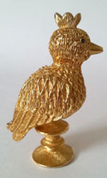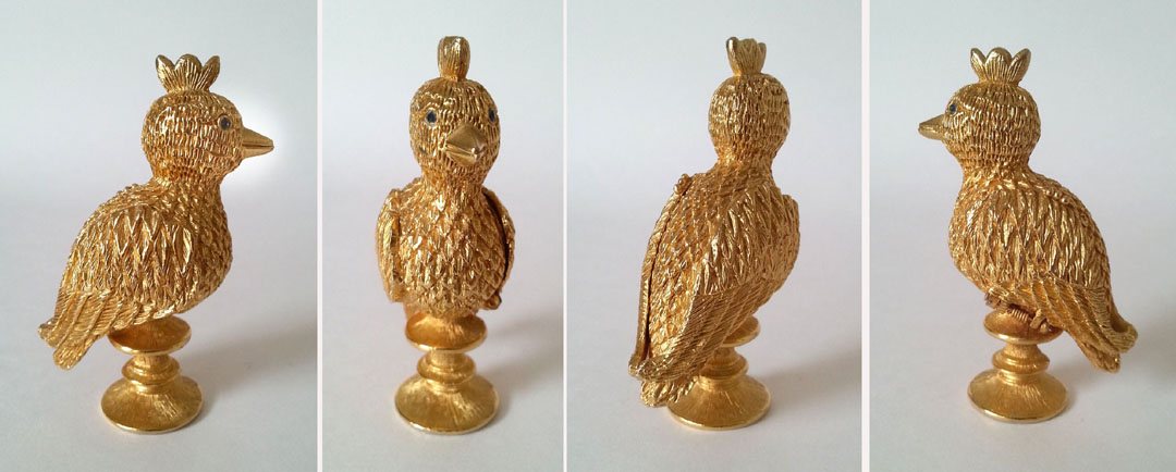 Large, figural solid perfume compact by Corday for, "Toujours Moi," creme perfume. The highly-detailed design is known as, "Le Coq d'Or" - The Golden Cockeral (perhaps after the Russian Rimskey-Korsakov opera of the same name.) This golden crested bird with blue rhinestone eyes is mounted on a pedestal. The hinged back wing covers the perfume compartment. The fragrance was an early Corday scent launched in 1924. "Toujours Moi" translates to "Always Me" or "Still Me." Gold foil bottom label. It has been used, but most of the perfume remains.